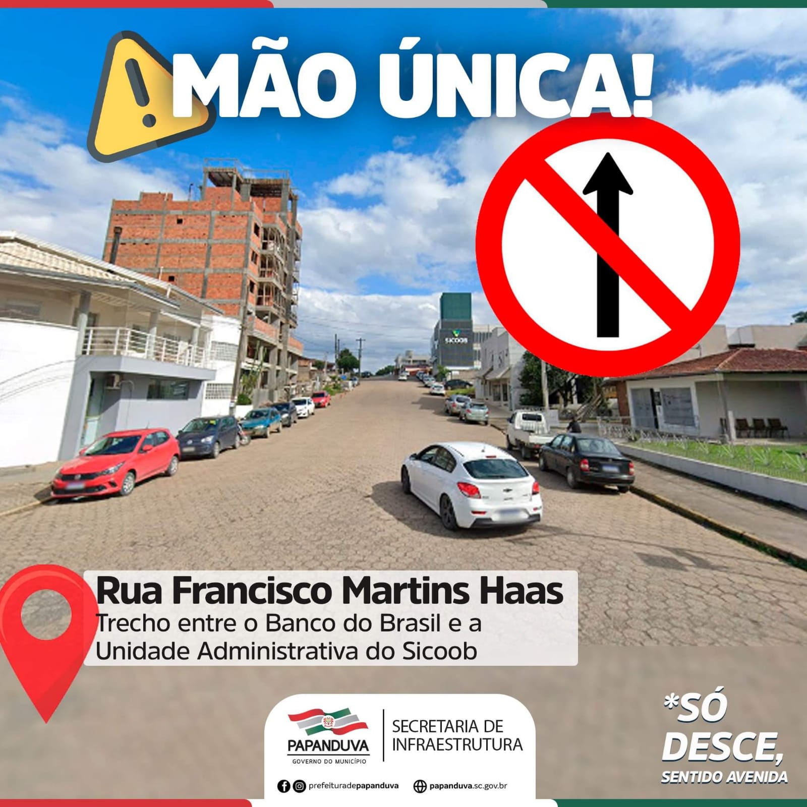 O Governo Municipal de Papanduva anunciou nesta quarta-feira uma série de alterações no tráfego da Rua Francisco Martins Hass, no trecho compreendido entre o Banco do Brasil e a Unidade Administrativa do Sicoob. As modificações, que incluem a adoção de sentido único e a melhoria do estacionamento em 45 graus, têm como objetivo melhorar a fluidez do tráfego e proporcionar maior segurança aos motoristas e pedestres.