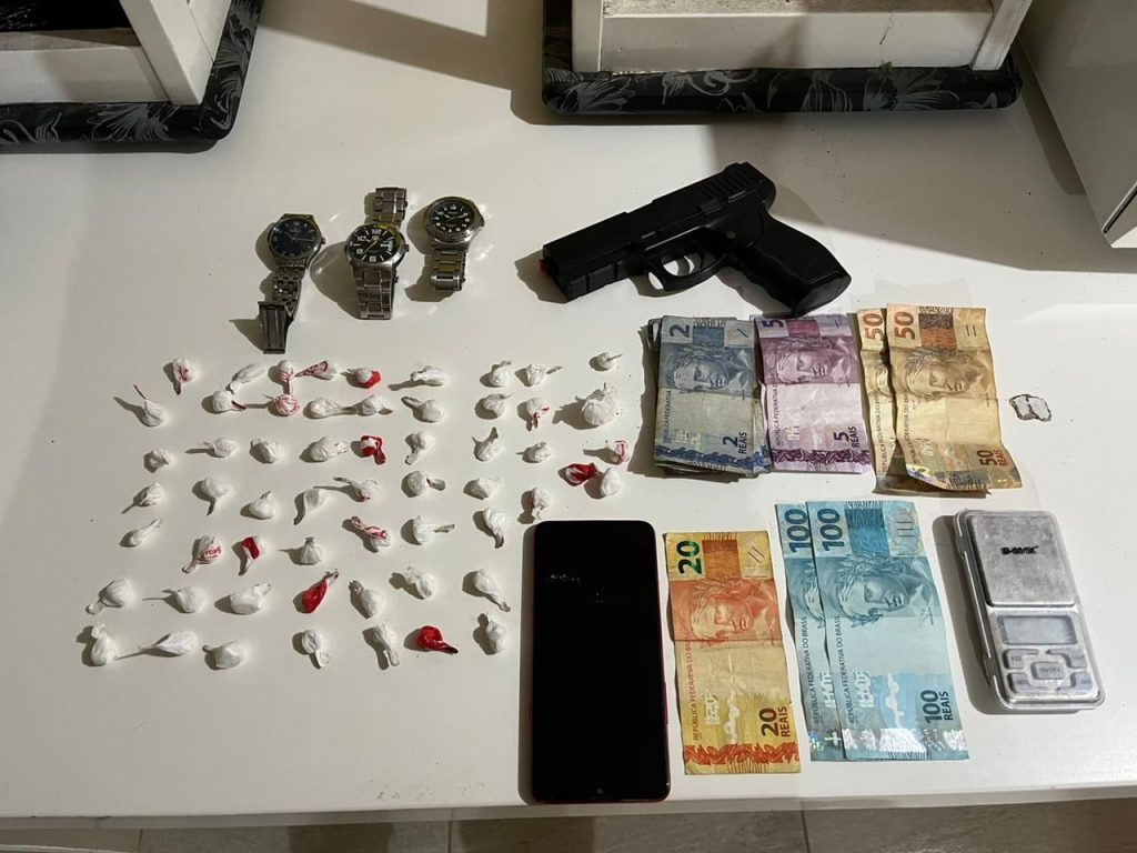 Em seguida, os policiais foram até a casa, localizada no bairro Boa Vista. Durante as buscas, encontraram 56 porções de cocaína, já embaladas e prontas para serem vendidas, pesando cerca de 31 gramas. Além disso, também apreenderam três celulares, uma balança de precisão e uma réplica de arma de fogo.