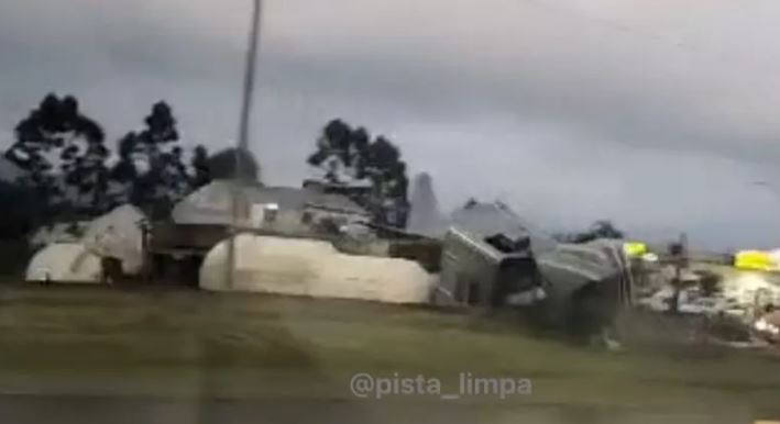 Uma carreta tombou no km 158,6 da BR-101/SC, em Porto Belo, sentido Porto Alegre, na manhã desta sexta-feira (28), bloqueando totalmente a via, pois o veículo tombou em L, ocupando as duas faixas.