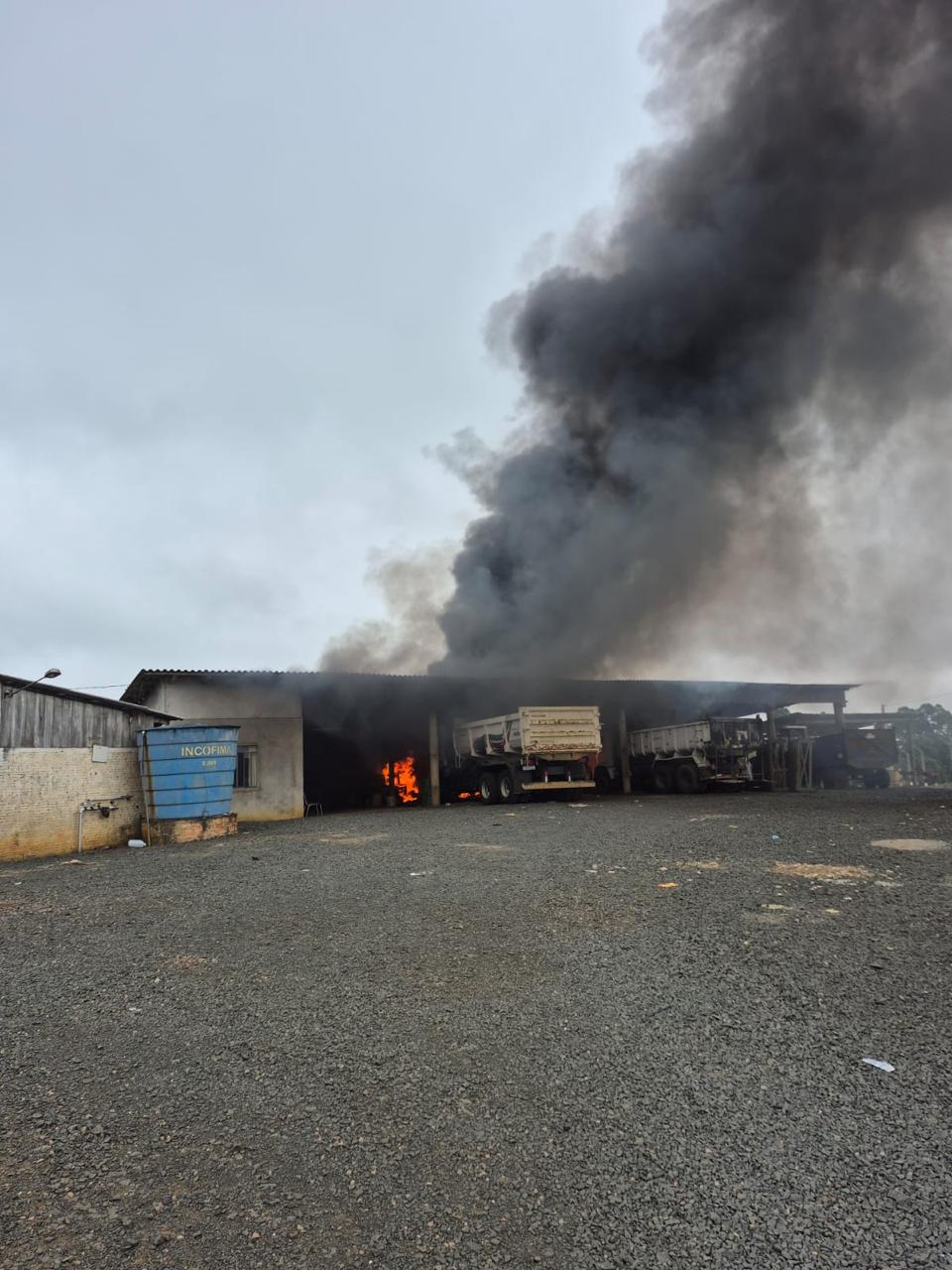 Fogo causou danos a caminhões e trator, mas rápida ação dos bombeiros evitou maiores prejuízos: