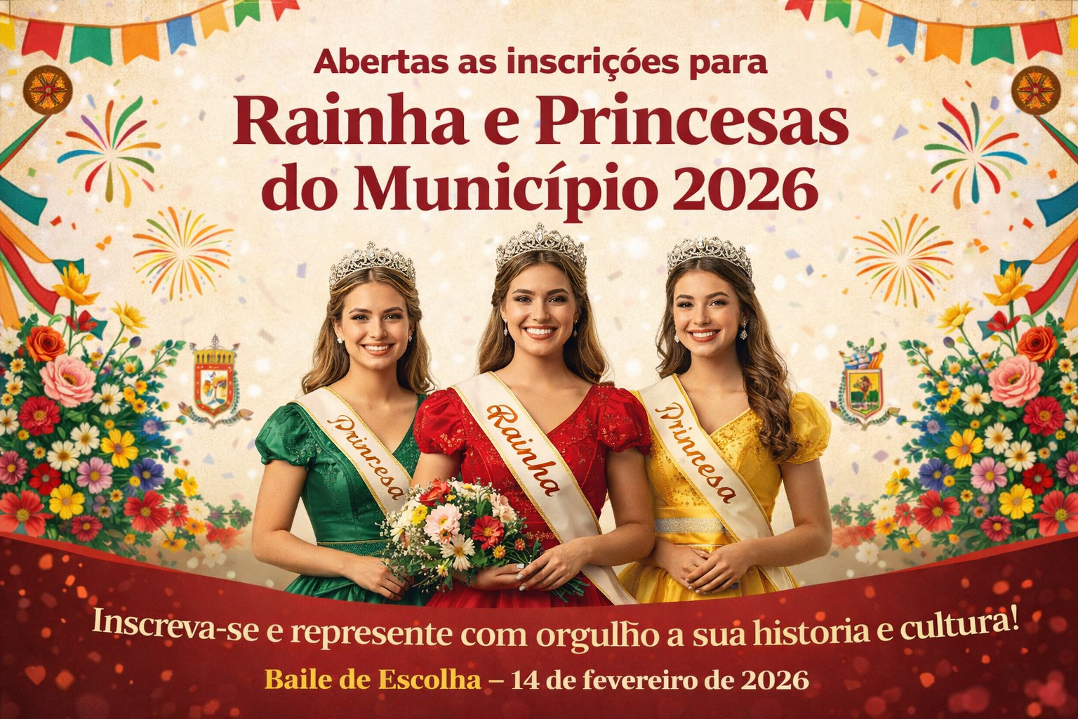 A Administração Municipal, por meio da Secretaria Municipal de Cultura, Turismo, Esportes e Juventude, informa que estão abertas as inscrições para candidatas a Rainha e Princesas do Município – 2026.