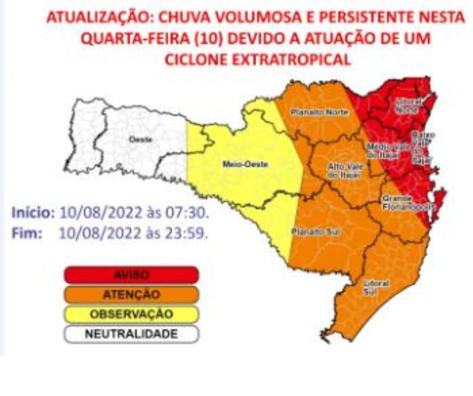 A atuação de um ciclone extratropical provoca chuva volumosa, persistente e por vezes intensa no Planalto Norte, Litoral Norte, Baixo e Médio Vale do Itajaí e Grande Florianópolis nesta quarta-feira(10). Os acumulados previstos para as áreas em vermelho do mapa variam de 100 a 250 mm, podendo pontualmente superar estes valores. Assim, o risco para ocorrências como alagamentos, deslizamentos, enxurradas e inundações nestas regiões é muito alto. Nas áreas em amarelo e laranja do mapa, ainda são esperados de 40 a 100 mm, mas o risco para ocorrências nas áreas em laranja é alto devido ao somatório da chuva já registrada com os volumes previstos. Nas áreas em amarelo, o risco para ocorrências é moderado.