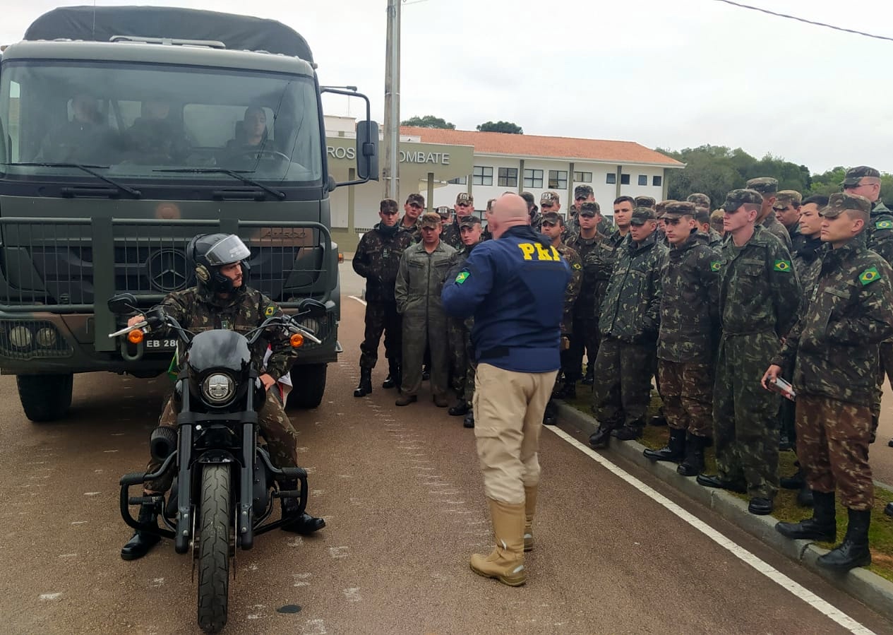 PRF realiza palestra para motociclistas do Exército Brasileiro em Rio NegroNa última terça-feira (30), a policiais rodoviários federais realizaram uma palestra para cerca de 200 recrutas do 5º Regimento de Carros de Combate (RCC) do Exército Brasileiro em Rio Negro/PR. Foram abordados temas como direção defensiva, equipamento de proteção individual (EPI) para motociclistas e equipamentos de uso obrigatório.Os PRFs realizaram atividades práticas com os recrutas feitas em uma pista de obstáculos com cones. Com suas respectivas motocicletas, eles puderam realizar manobras colocando em prática o que haviam aprendido anteriormente.Fonte: PRF