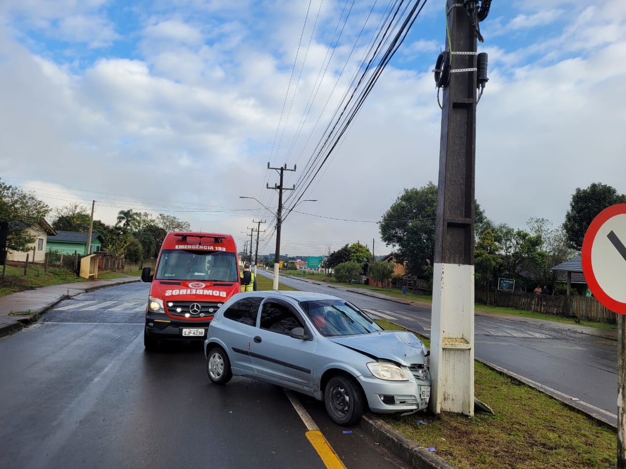 Trata-se de um acidente de trânsito, no qual um veículo Chevrolet Celta, cor prata, placas de Papanduva-SC, havia colidido com um poste no canteiro central da via. No local, foi encontrado duas vítimas: A condutora do veículo, uma mulher de 38 anos, consciente, orientada, gestante de 8 meses, apresentava uma escoriação na cabeça, estava sentada no canteiro central da via. A segunda, uma mulher 58 anos, que estava como carona no veículo, consciente e orientada, encontrava-se sentada no canteiro central da via, sem lesões aparentes.