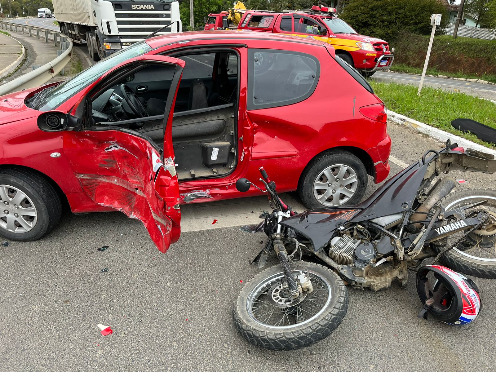 O outro veículo, uma motocicleta Yamaha XTZ Placa Mercosul de Mafra, conduzida por um homem de 21 anos, que se encontrava deitado na pista de rolamento, consciente e orientado, apresentando escoriações na perna e mão direita, e ferimento no rosto.