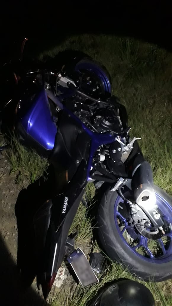 A moto, uma YAMAHA MT, placa de Canoinhas, conduzida por um homem de 20 anos, caído sobre o acostamento, inconsciente, amparado por populares, com suspeita de traumatismo craniano, e um corte no rosto com hemorragia.