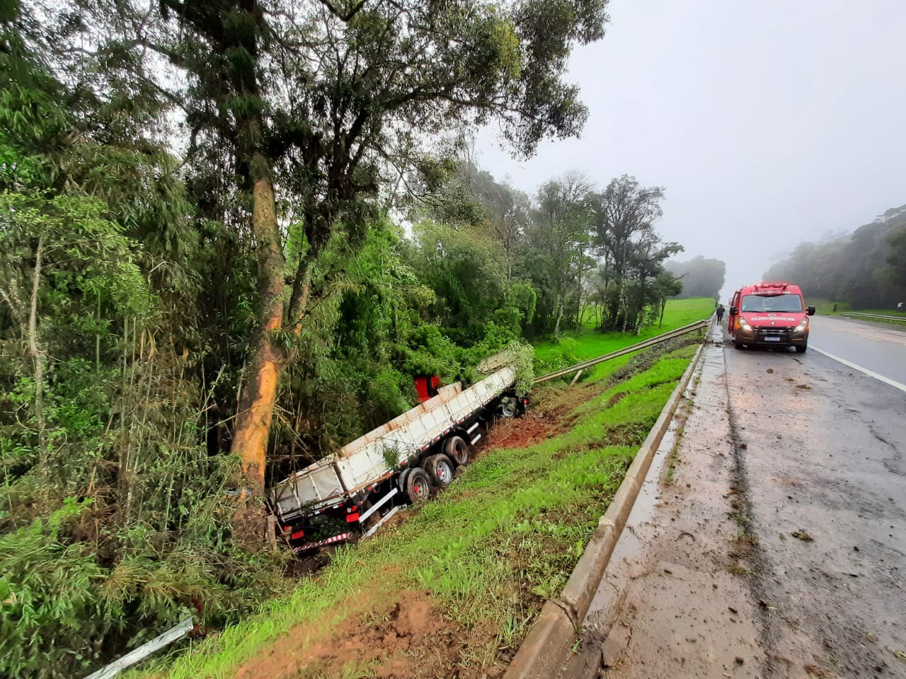 No local, encontrava-se um caminhão Volkswagen Meteor vermelho, com Placas de Mafra, conduzido por um homem de 44 anos.