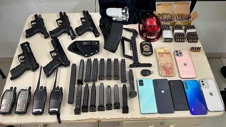 Na residência, com a presença do advogado e da irmã de um dos envolvidos, foi realizada a busca, sendo localizadas e apreendidas três pistolas, estando uma com kit Rone; três carregadores de fuzil; um carregador alongado, calibre 9mm; 11 carregadores de pistola; 161 munições, calibre 9mm; um distintivo da Polícia Civil; dois simulacros de arma de fogo; um giroflex, utilizados em viaturas policiais; balanças de precisão; quatro rádios comunicadores; e duas balaclavas.