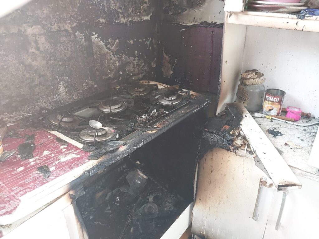 Após análise, constatou-se que o incêndio ficou confinado no interior da cozinha, queimando um cooktop, chaleira elétrica, um armário com utensílios domésticos e parte do forro.