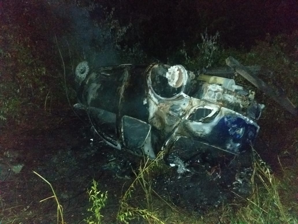 Ainda segundo os socorristas, o veículo em que eles estavam, um Ford Ka, com placas de Jaraguá do Sul (SC), estava desocupado e capotado na lateral da rodovia. Após o capotamento, o carro também colidiu contra um poste de energia elétrica, estando a fiação da rede elétrica sobre o veículo, que estava totalmente tomado por um incêndio.