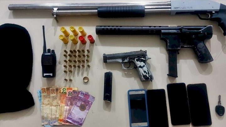 Ao realizar a revista pessoal e busca veicular, foi encontrado dinheiro, munições e uma touca balaclava. Na residência dos envolvidos, no outro lado da rua, os militares solicitaram para fazer as buscas e autorizado pelo proprietário, sendo apreendido uma submetralhadora calibre 9 mm, uma espingarda calibre 12 e uma pistola calibre 765.