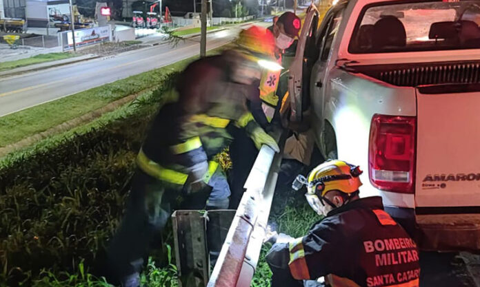 Os bombeiros usaram uma serra para cortar o guard-rail e retirar a vítima. O local foi isolado pela Polícia Rodoviária Federal até a chegada do Instituto Médico Legal.