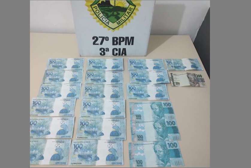 No veículo, foi encontrado embaixo da capa do banco traseiro, um pequeno fardo de notas de R$ 100, totalizando R$ 1,8 mil, todas falsas. Foi ainda encontrada na bolsa da mulher, outra quantia em dinheiro de notas falsas, totalizando R$ 300, sendo uma nota de R$ 100 e outra de R$ 200.