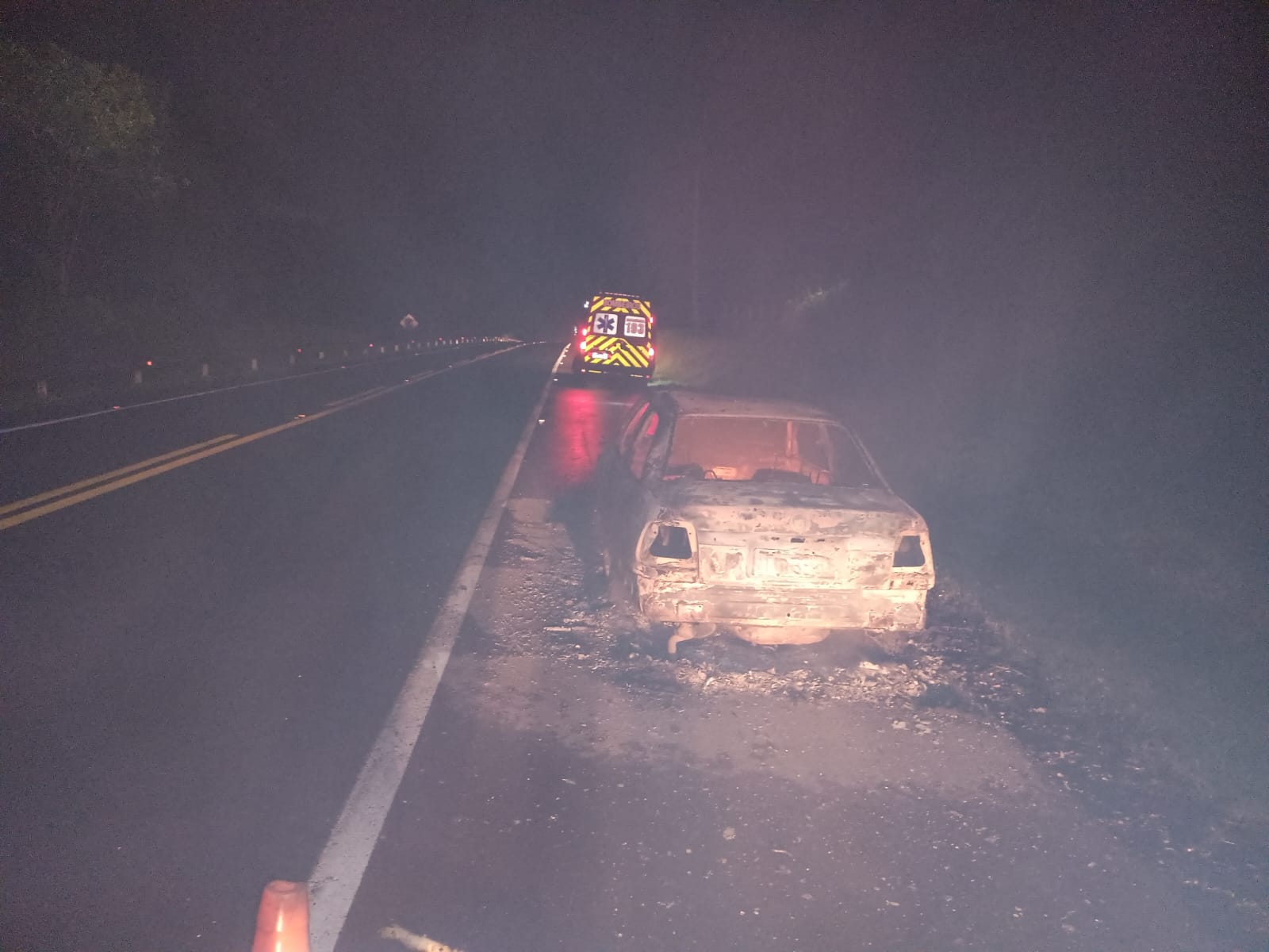No local, os bombeiros se depararam com um veículo VW Logus, com placas de Canoinhas, totalmente consumido pelas chamas, encontrado no acostamento da via. A equipe de resgate iniciou imediatamente os procedimentos de combate ao fogo, utilizando cerca de 1.000 litros de água para resfriar a área e controlar as chamas.
