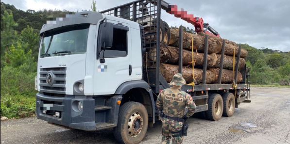 Polícia Militar Ambiental Flagra Transporte Irregular de Toras de Pinheiro-Brasileiro Entre Carga de Pinus