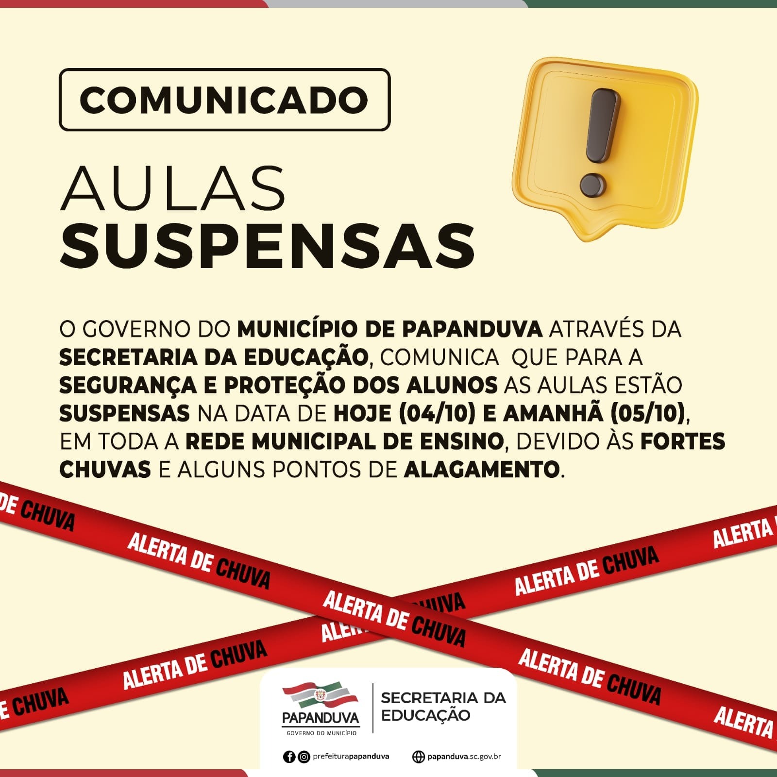 O Governo do Município de Papanduva através da Secretaria da Educação, comunica que para a segurança e proteção dos alunos as aulas estão suspensas na data de hoje (04/10) e amanhã (05/10), em toda a rede municipal de ensino, devido às fortes chuvas e alguns pontos de alagamento.