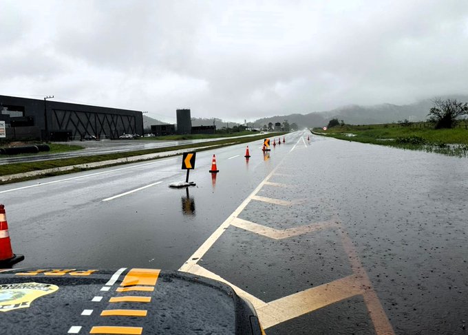 Pontos de interdição em rodovias federais de SC (atualização: 09/10 – 07h30)BR-101 km 403 norte em Araranguá: água sobre a pista, fluxo desviado para pista sul, uma faixa em cada direção.