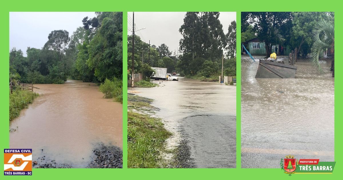 Nas últimas horas, foi registrado o transbordo dos Rios Negro, Barra Grande e Canoinhas em alguns pontos do município de Três Barras, causando assim trechos de alagamentos no Jardim Rio Negro, e bairros Zilda Pacheco/Argentina, João Paulo II e Bom Jesus, que ficam na sede do município; no distrito de São Cristóvão; e também em localidades interioranas como Colônia Tigre, Campininha e São João dos Cavalheiros.