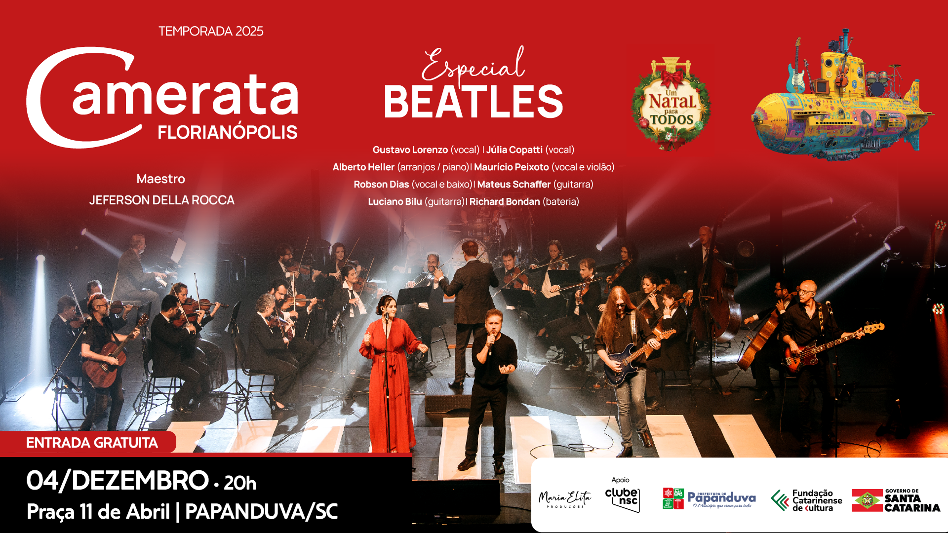 O show, marcado para 20h na Praça 11 de Abril, reúne músicos renomados da Camerata Florianópolis, sob a regência do maestro Jeferson Della Rocca, interpretando clássicos dos Beatles em arranjos emocionantes que misturam orquestra, banda e vozes. A apresentação faz parte da temporada 2025 do grupo e integra o projeto “Um Natal Para Todos”, com apoio da Fundação Catarinense de Cultura, Governo do Estado e Prefeitura de Papanduva.